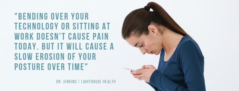 The biggest challenge is that bending over technology or sitting at work or school doesn’t cause pain today. But it will cause a slow erosion of your posture over time.